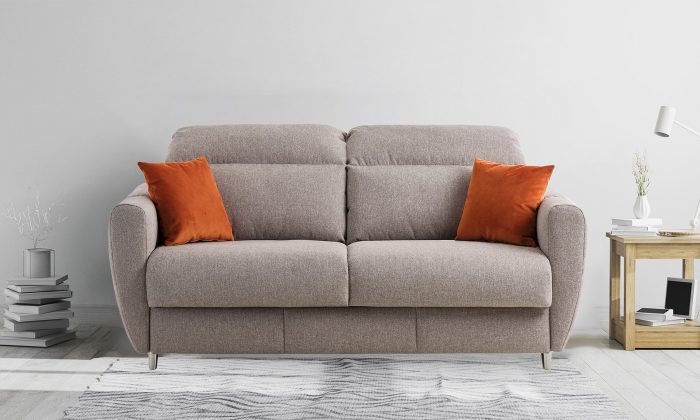 Canapé Convertible 3 places en tissu beige avec passepoil en pistache. Il est fermé avec deux coussins couleur pistache.