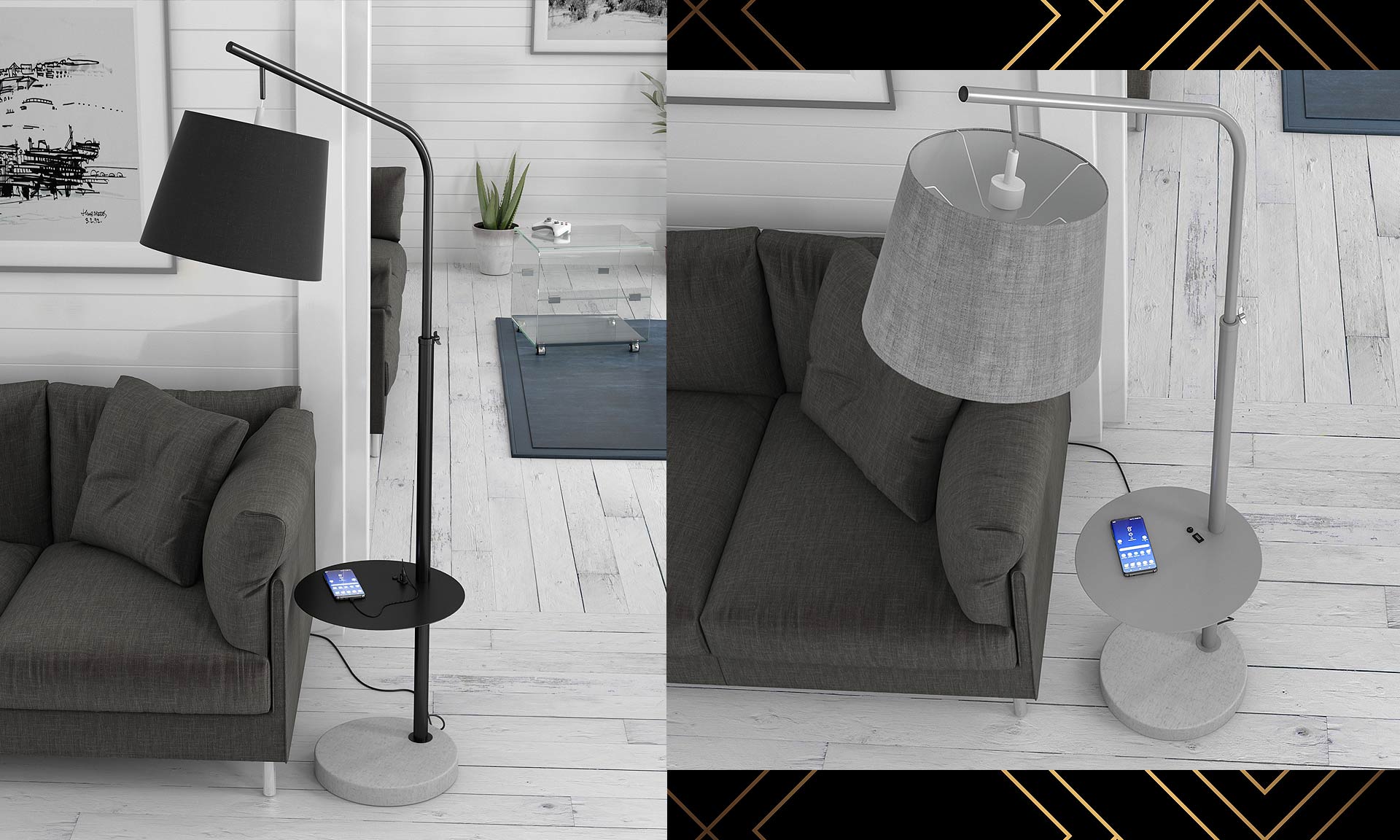 Ce lampadaire multi-fonctions Meubloo est à la fois esthétique et pratique avec un pied en béton gris. Il dispose aussi d’une tablette qui peut faire office de coin canapé. Cette tablette pivote autour de l’axe du lampadaire et permet de la positionner à la hauteur idéale. La hauteur de l’abat-jour peut aussi être réglée, tout comme la direction de l’abat jour. Structure en acier laqué noir ou gris et un abat-jour noir ou gris.